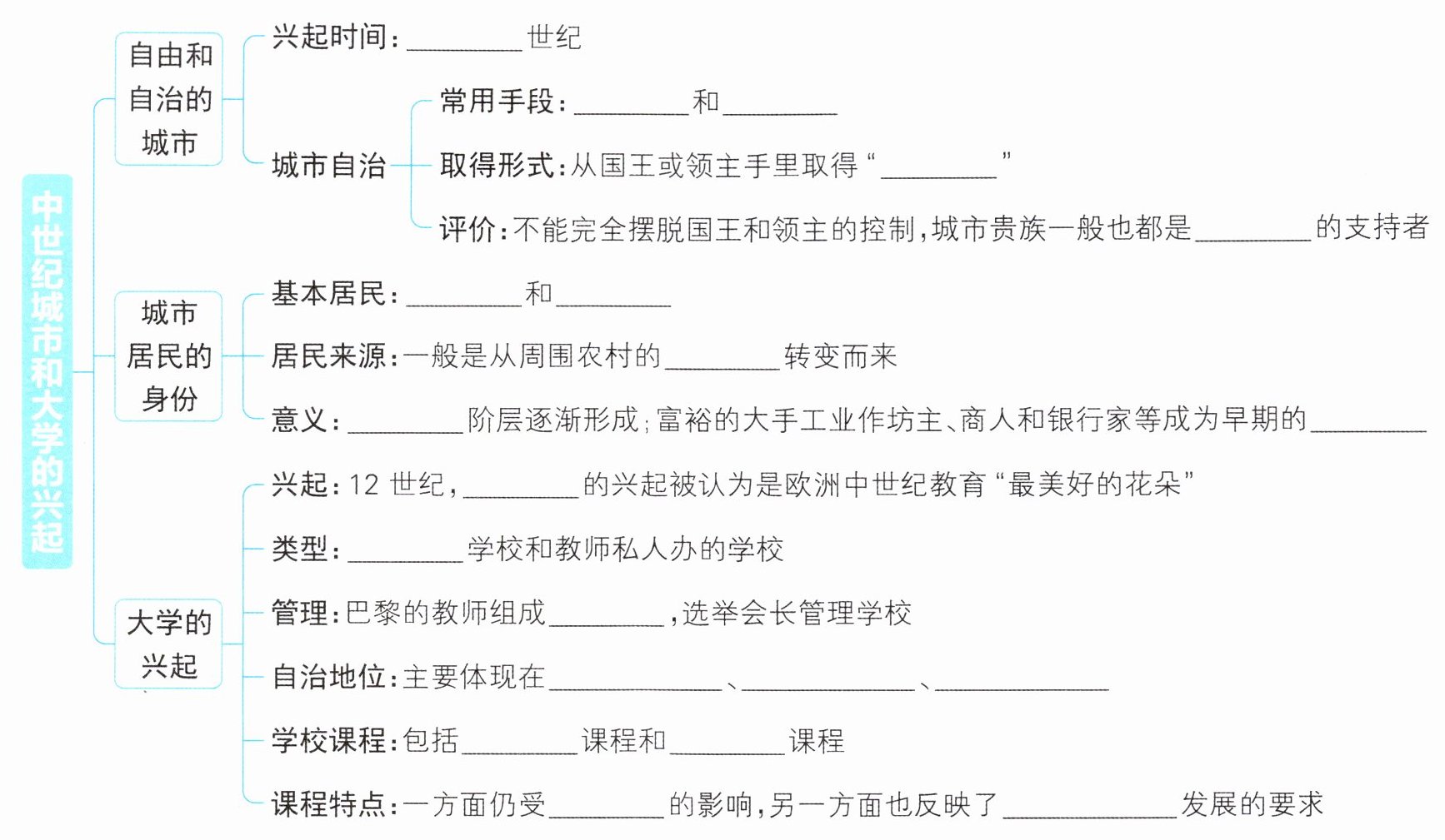 【解析】:本题考查中世纪城市和大学的兴起的相关知识点,包括自由和自治的城市、城市居民的身份以及大学的兴起等方面的知识,需要对课本相关内容进行准确记忆和梳理。