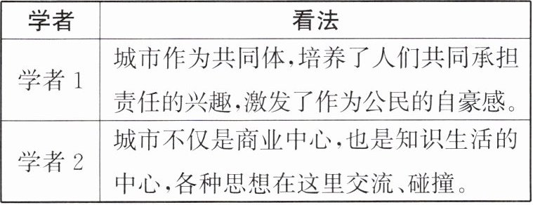 【解析】:本题考查中世纪后期西欧城市的相关知识点。学者1提到城市作为共同体培养了人们的责任感和公民自豪感,学者2提到城市不仅是商业中心也是知识生活中心,各种思想在这里交流碰撞。这些内容主要是在阐述中世纪后期西欧城市兴起后所带来的影响,比如对人们思想意识、文化生活等方面的影响。A选项兴盛的原因在材料中并未体现,材料主要是说城市兴起后的情况而非兴起的原因;C选项市民的权利在材料中没有相关表述;D选项大学的兴起只是学者2观点中关于城市是知识生活中心这一方面的部分体现,不能全面概括材料内容。