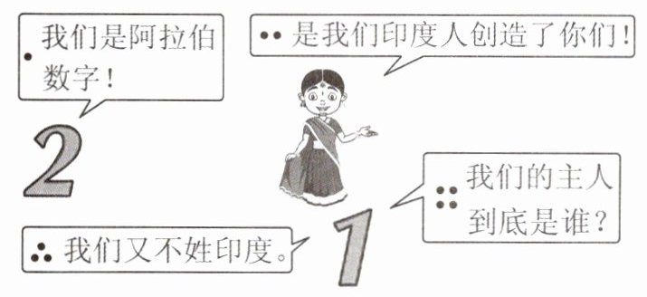 【解析】:本题可根据漫画内容,结合所学知识分析其主题。漫画中阿拉伯数字的对话“我们是阿拉伯数字!”“是我们印度人创造了你们!”“我们又不姓印度。”体现了阿拉伯数字虽然被称为阿拉伯数字,但实际上是由印度人创造的,阿拉伯人传播了它,这反映了不同文明之间的交流与传播。