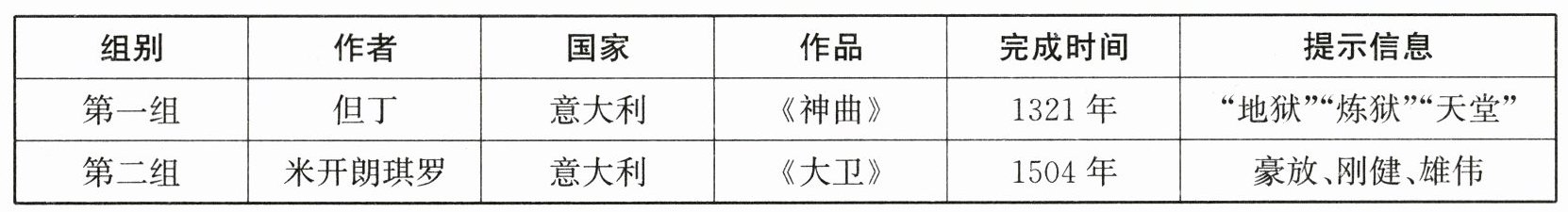 (2)第一组:《神曲》这部作品通过诗人对地狱、炼狱和天堂的认识,体现了人文主义关于人的自由、平等和博爱的思想。但丁通过这部作品,表达了对人类智慧和勇气的赞美,对封建道德和教会腐败的批判,彰显了人文主义精神。