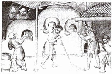 4. 右图描绘了中世纪晚期玻璃加工的场景,从图中可以看出,生产玻璃的不同工序集合在同一个场所,以便对劳动进一步实行分工。作为史料,该图可用于佐证(
