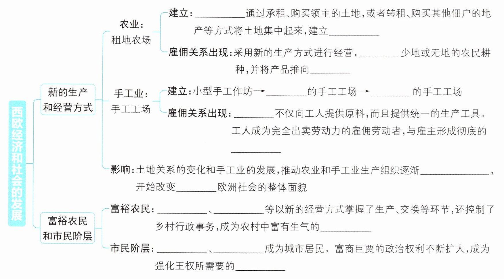富裕农民:富裕农民、骑士等以新的经营方式掌握了生产、交换等环节,还控制了乡村行政事务,成为农村中富有生气的阶级力量