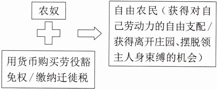 )农奴 + 用货币购买劳役豁免权/缴纳迁徙税 → 自由农民(获得对自己劳动力的自由支配/获得离开庄园、摆脱领主人身束缚的机会)