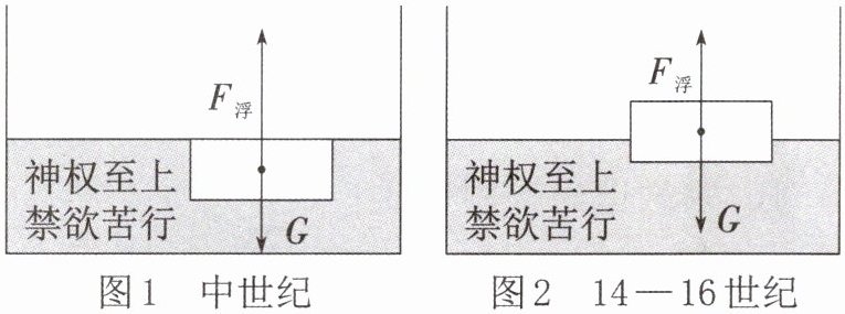 题干中提到漂浮在液体中的物体,在自身重力不变的情况下,重力小于浮力时就会上浮,反之则会下沉。图1到图2的变化体现了物体(可理解为人的思想等)从下沉到上浮,即从“神权至上、禁欲苦行”到摆脱这种状态的变化。