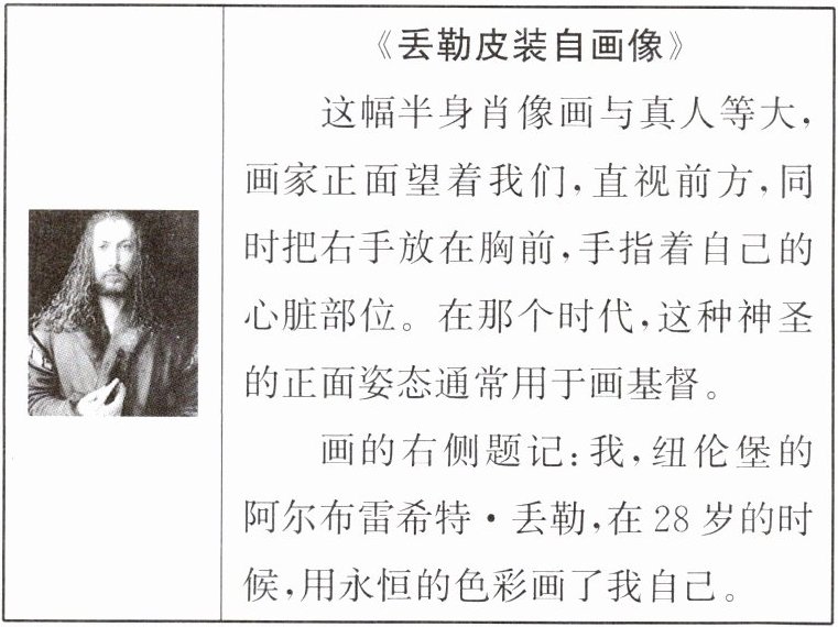 【解析】:本题可根据文艺复兴运动的核心思想,结合题干中关于《丢勒皮装自画像》的描述来进行分析。