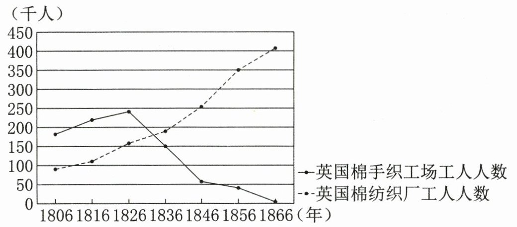 23. 下图所示的是英国棉手织工场、棉纺织厂工人人数变化情况。据此可知,工业革命(