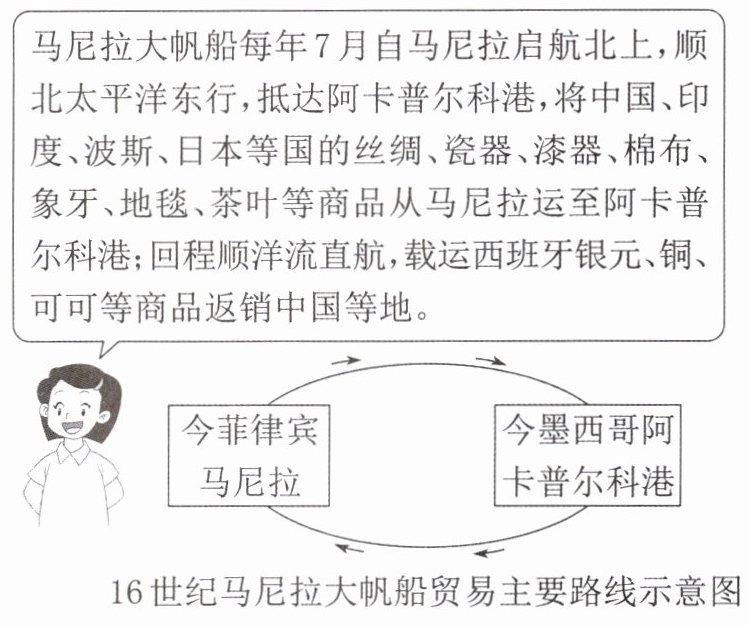 特点:贸易路线以马尼拉为中转站,连接亚洲和美洲;贸易商品种类丰富,包括丝绸、瓷器、茶叶等亚洲商品和西班牙银元、铜、可可等美洲商品;贸易具有双向性,既有从亚洲到美洲的商品输出,也有从美洲到亚洲的商品输入。