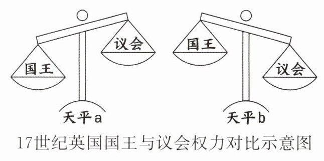 【解析】:本题考查英国君主立宪制相关知识。天平由a到b的变化,意味着议会的权力超过了国王的权力。