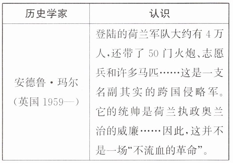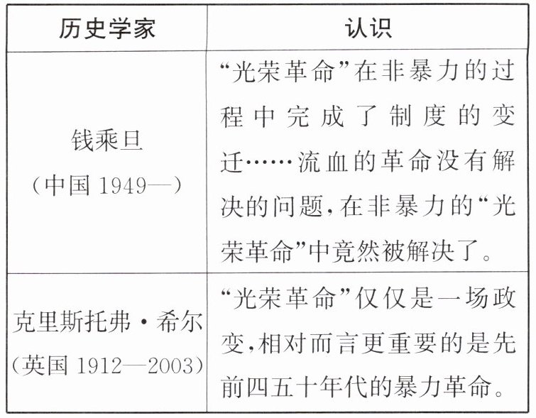 (1)安德鲁•玛尔:认为光荣革命是跨国侵略,并非不流血革命;钱乘旦:认为光荣革命以非暴力方式完成制度变迁,解决了流血革命未解决的问题;克里斯托弗•希尔:认为光荣革命仅是政变,先前暴力革命更重要。原因:立场、视角、史料选取不同。