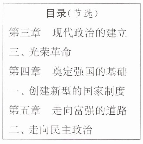 D选项提到的“资产阶级政治民主化进程”,与章节中的“现代政治的建立”、“光荣革命”、“创建新型的国家制度”以及“走向民主政治”等内容高度相关。这些章节标题共同反映了英国从封建专制向资产阶级民主政治的转型过程。