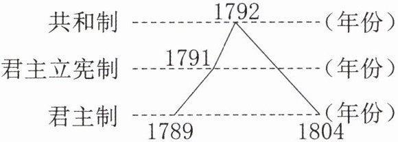 【解析】:本题主要考查法国大革命的特点,从所给图片中可以看到,法国在1789 - 1804年期间政体不断变化,从君主制到君主立宪制,再到共和制,之后又有变化,这明显体现出政体出现反复的特点。A选项符合图片所反映的信息;B选项“革命旷日持久”主要强调的是革命持续的时间长,但图片重点突出的是政体的变化,而非时间长短,所以B选项不符合;C选项“革命最终失败”从图片中无法得出这一结论,法国大革命有其重要的历史意义,不能简单说最终失败;D选项“具有世界影响”图片中也没有相关内容体现。