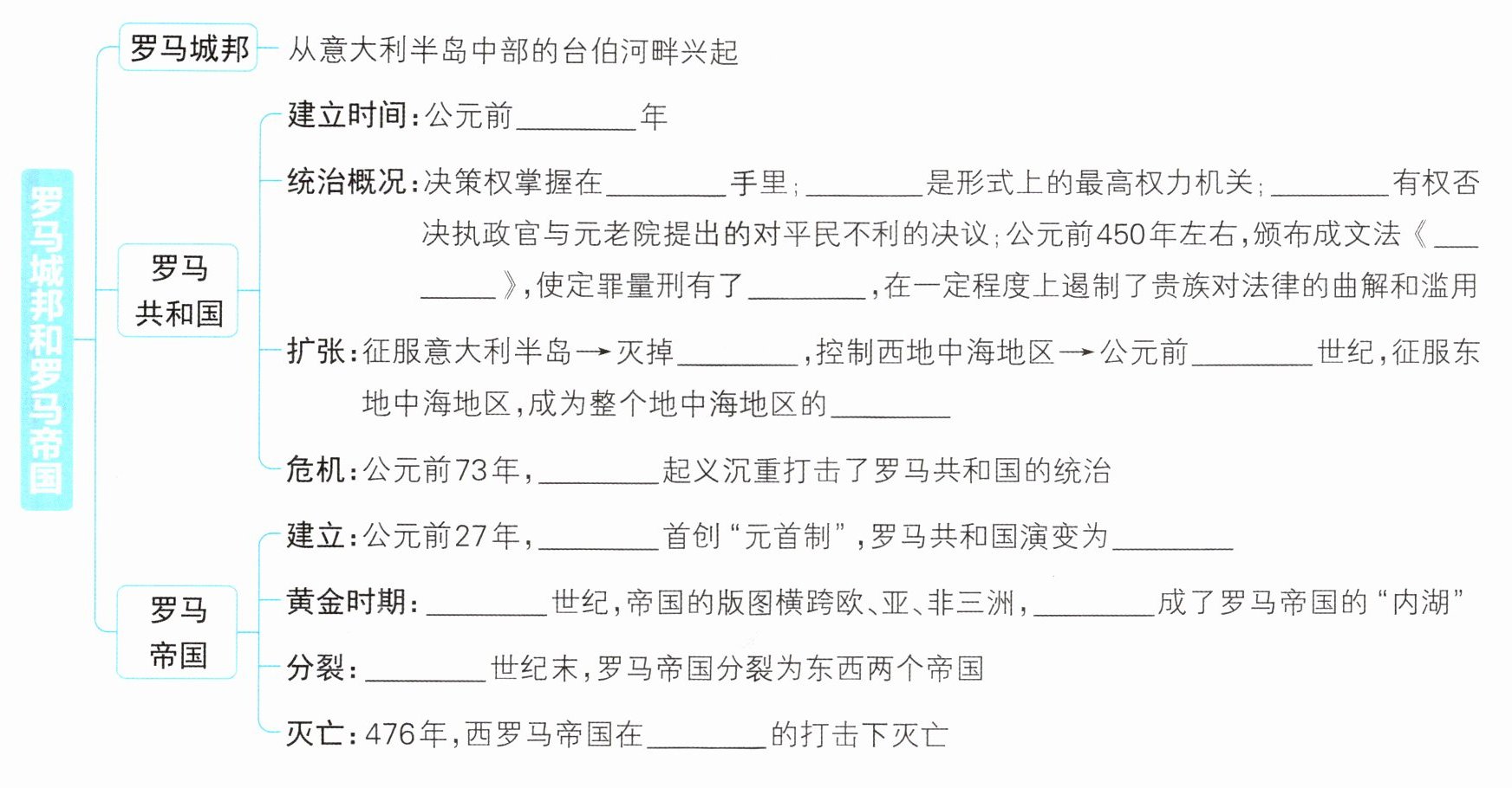 本题主要考查罗马城邦和罗马帝国的相关知识,包括罗马共和国的建立时间、统治机构、法律成就,罗马帝国的建立、黄金时期、分裂和灭亡等。需要根据教材内容进行填空,考查对基础知识的记忆和理解。