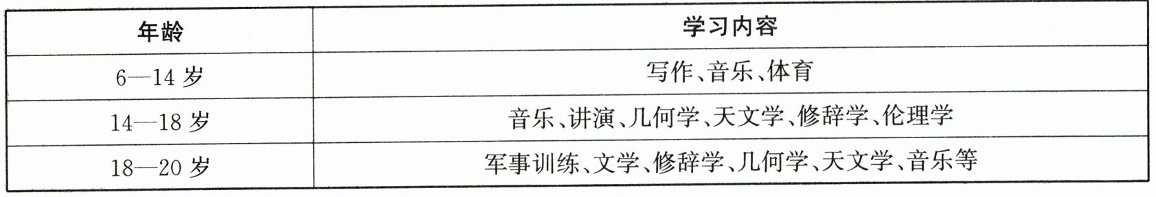 7. 伯里克利执政时期,雅典公民的男性后代必须接受8年的初级教育,富家子弟可继续接受约4年的中等教育,学习内容见下表。这表明当时的雅典(