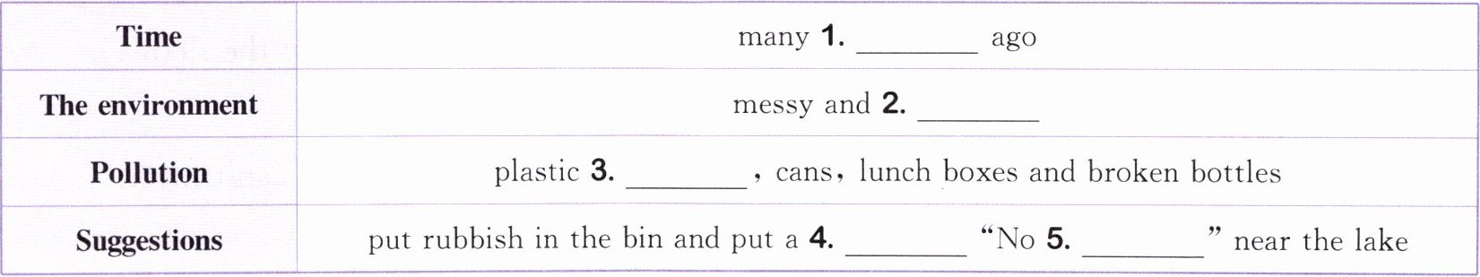 We went to a lake many years ago. The lake was messy and dirty. What made the lake messy and dirty? There were a lot of plastic bags, cans and lunch boxes. There were some broken bottles too. The pollution was serious. To keep the lake clean, we should put rubbish in the bin and put a sign “No littering” near the lake. We shouldn’t litter everywhere. Everyone should know this and protect the lake. This year, the lake becomes more beautiful. We are happy to see that.