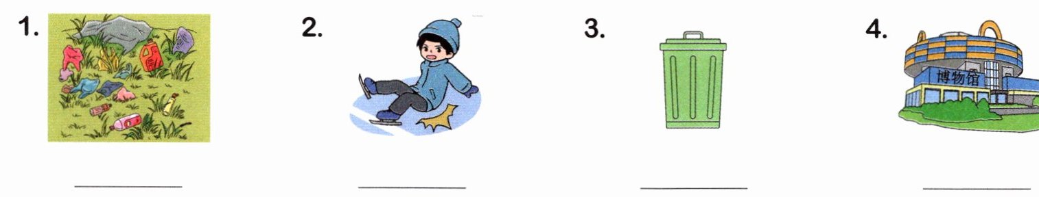 四、1. Billy slips on the banana skin and falls. 2. We can walk to school. 3. Bobby and Tina are walking home after school. 4. Bobby, you should put your rubbish in the bin. 5. There was rubbish in the water, and the fish were dead. 6. — What made the streets messy and dirty? — Rubbish made the streets messy and dirty.