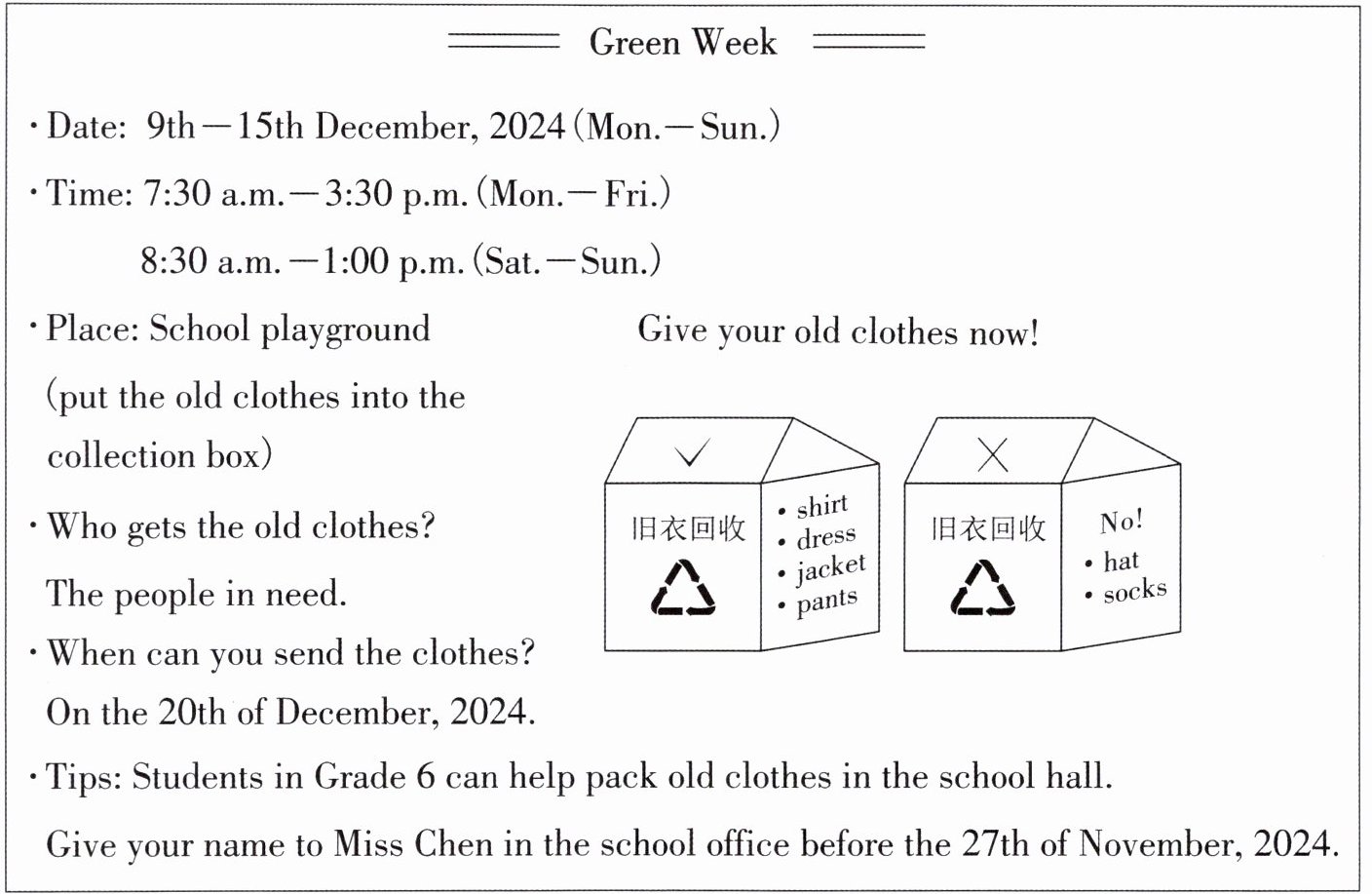 on Saturday, students can put the old clothes in the collection box.A. 7:30 a.m.