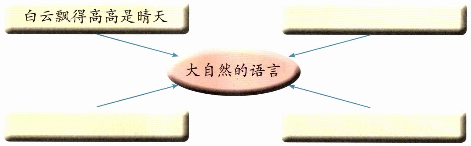 1 朗读诗歌,说说诗中介绍了哪几种大自然的语言,找一找、填一填,把下面的思维导图补充完整。