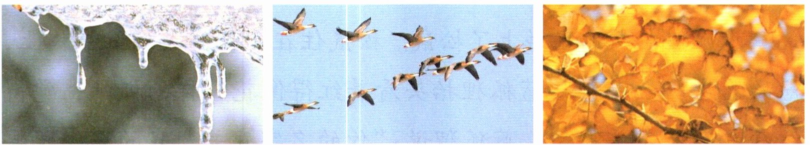 解析 本题考查学生提取信息和评价鉴赏的能力。题目中三幅图依次是冰雪融化、大雁南飞、银杏叶黄了,这些都是大自然的语言,模仿诗歌的第二、三、四、五节,写成三排的小诗,诗中写清什么事物怎么样,是大自然在诉说些什么,语句通顺即可。