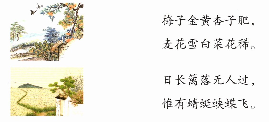 解析 本题考查学生对诗意的理解及评价鉴赏的能力。仔细观察图1,能找到蜻蜓、蝴蝶、屋舍、篱笆,这与第三、四两句诗中的“篱落”“蜻蜓蛱蝶”相对应;图2中有大片雪白的麦花、伸出围墙的杏子,与第一、二句中的“杏子肥”“麦花雪白”是相呼应的。