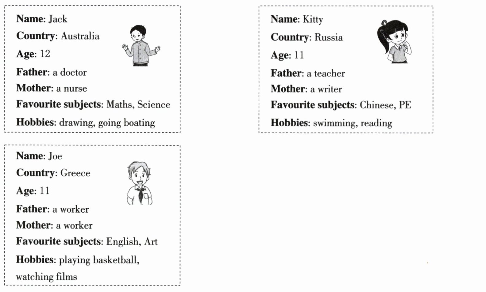 你想交外国朋友吗?下面有三位外国小朋友的信息卡片,请你选择其中一位了解并介绍。