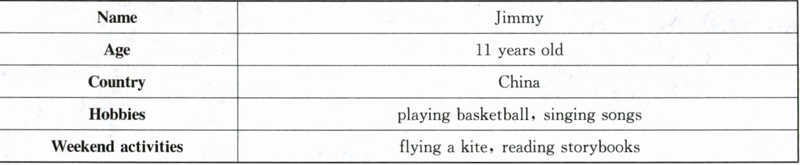 Look! This is my e-friend. His name is Jimmy. He is 11 years old. He lives in China. He likes playing basketball and singing songs. He says playing basketball is good exercise.