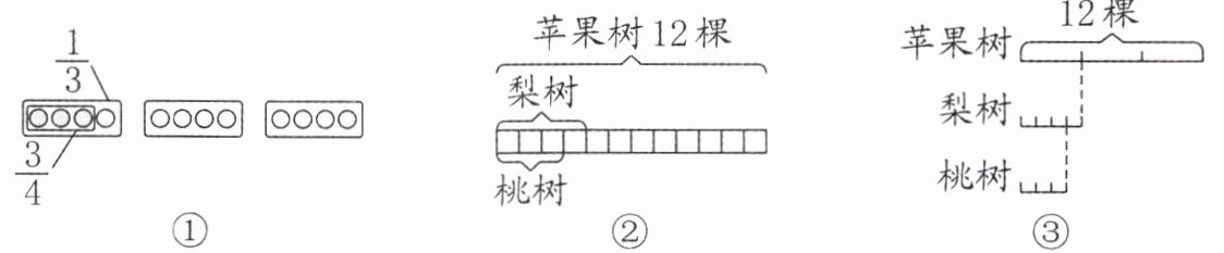 4. 新趋势 数形结合 果园里的苹果树有 12 棵,梨树的棵数是苹果树的$\frac{1}{3}$,桃树的棵数是梨树的$\frac{3}{4}$。下面能表示它们棵数的数量关系的是( )。