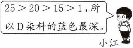(1)$20:100$ $10:100$ (2)不对 因为A中$15:60=1:4$,C中$20:200=1:10$,D中$25:150=1:6$,前项相同,后项越小,比值越大,颜色越深。因为$4<5<6<10$,所以A染料蓝色最深