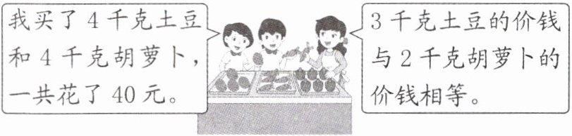 土豆:4÷2×3 + 4 = 10(千克)40÷10 = 4(元) 胡萝卜:3×4÷2 = 6(元) 解析:由“3千克土豆的价钱与2千克胡萝卜的价钱相等”,可知6千克土豆的价钱与4千克胡萝卜的价钱相等,题目中4千克胡萝卜的价钱可换成6千克土豆的价钱。40元一共可以买到(4 + 6)千克土豆,这样可以得知每千克土豆的价钱。