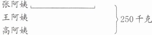 图略 张阿姨:250 - 30 + 20 = 240(千克)240÷3 = 80(千克) 王阿姨:80 + 30 = 110(千克) 高阿姨:80 - 20 = 60(千克)