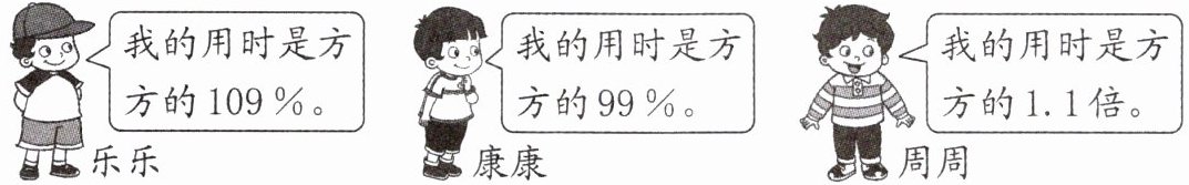 冠军是康康,亚军是方方,季军是乐乐 周周的用时是方方的 1.1 倍,1.1 = 110%,即周周的用时是方方的 110%。99% < 100% < 109% < 110%,对应的是康康的用时 < 方方的用时 < 乐乐的用时 < 周周的用时,跑步比赛中用时越短成绩越好