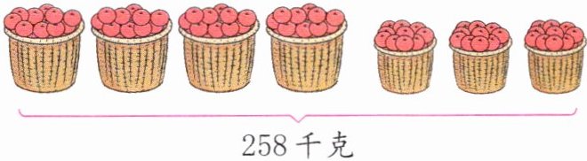 (1) (镇江真题)如图,每个大筐比每个小筐多装12千克苹果。假设7个都是小筐,装的苹果要比258千克少( )千克。