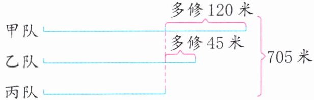 从线段图中可知三队一共修了$705$米,甲队比丙队多修$120$米,乙队比丙队多修$45$米。
