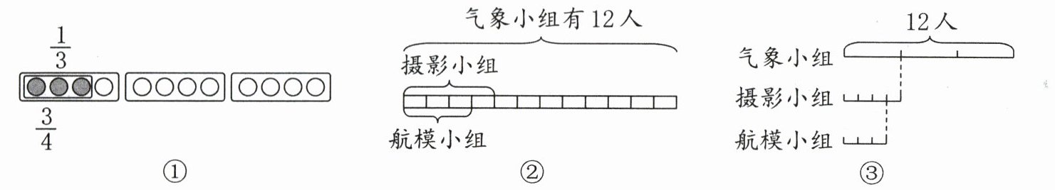 4. 气象小组有12人,摄影小组的人数是气象小组的$\frac {1}{3}$,航模小组的人数是摄影小组的$\frac {3}{4}$。下面能正确表示各小组人数的数量关系的是( )。