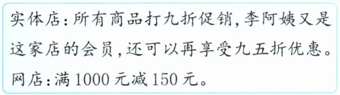 5. 李阿姨看中一款羽绒服,标价为1200元。李阿姨选择在哪里购买划算?
