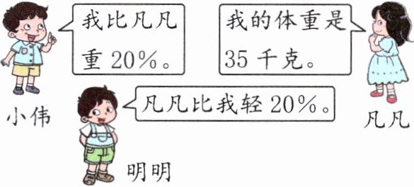 解:设明明的体重是 $ x $ 千克。$ x - 20\%x = 35 $ $ x = 43.75 $小伟: $ 35×(1 + 20\%) = 42 $(千克)