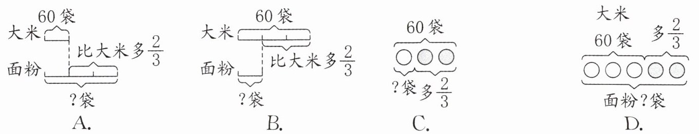2. 超市有大米60袋,面粉的袋数比大米多$\frac {2}{3}$,面粉有多少袋? 画图表示题意,正确的是( )。