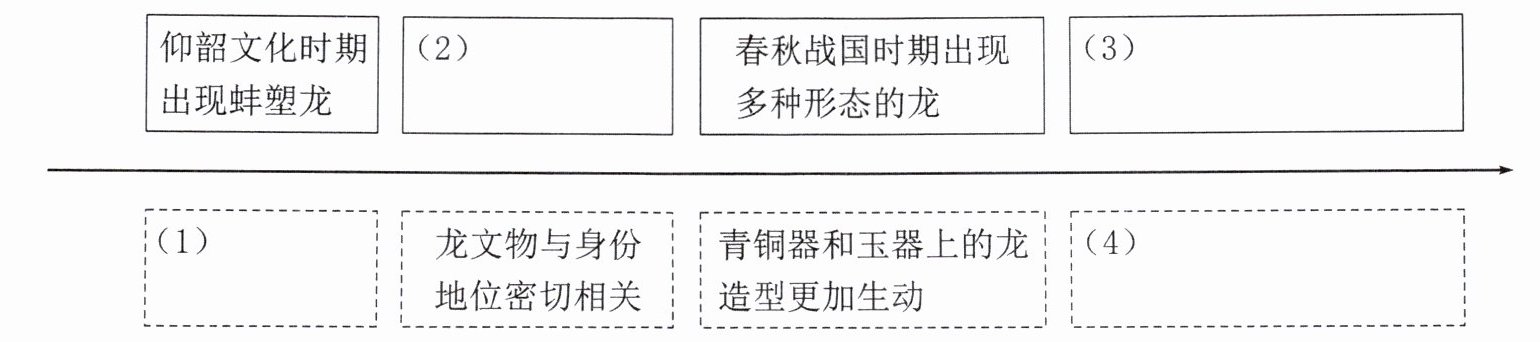 9. 千百年来,古人塑造的“龙”不断演变,贯串着中华文明起源、形成与发展的全过程,成为中华民族独特的精神图腾,让我们一起开启寻“龙”之旅。请同学们根据下面的材料完成时间轴。要求语言简洁,每处不超过15字。