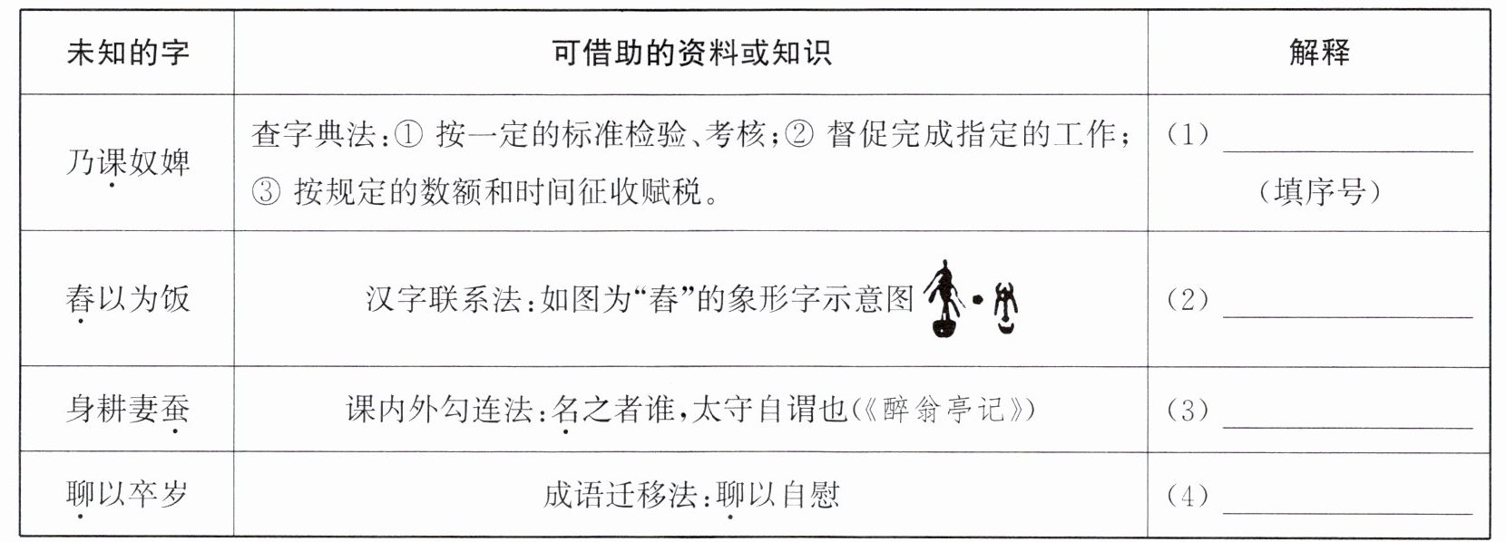 10. 请参考表格提示的相关资料或知识,帮小语补全对未知的字的理解。