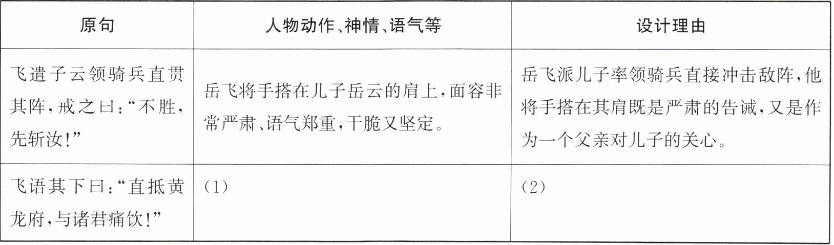 (1)岳飞右手挥拳,神情坚毅,语气高昂、豪迈。
