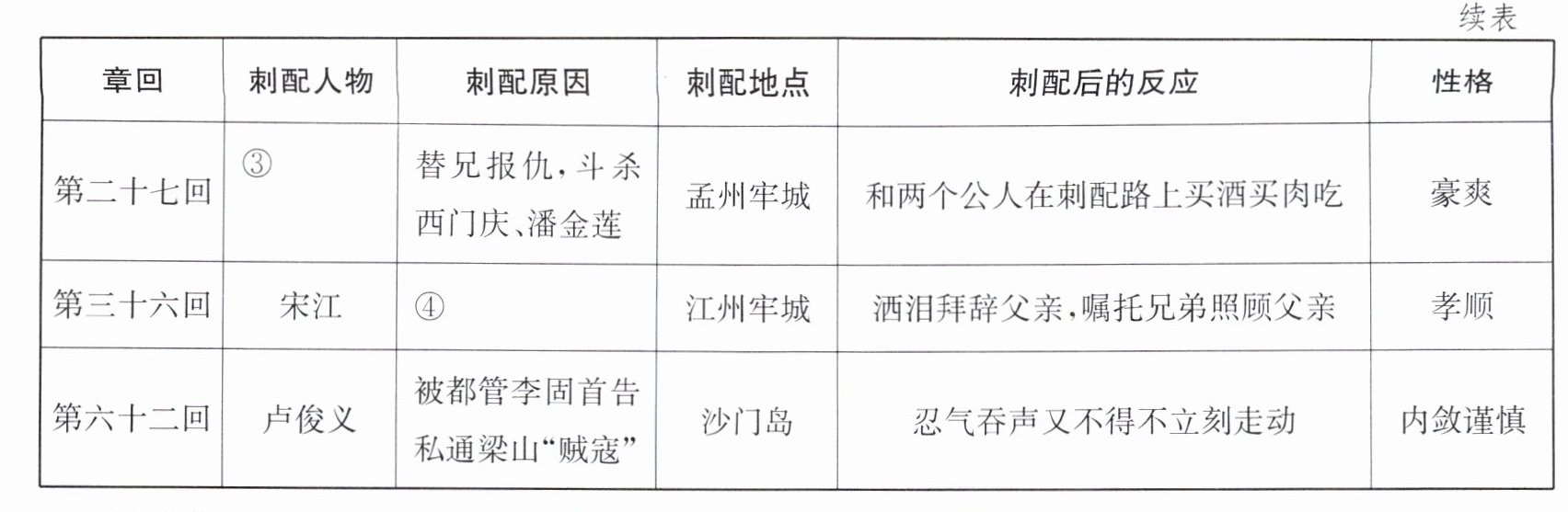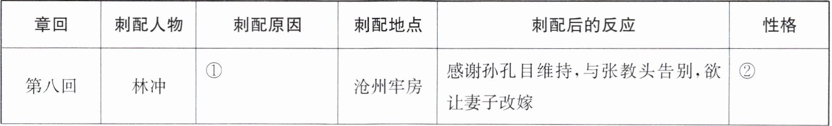 (1) 作者借各人刺配后不同的反应,刻画出人物的不同性格特点。请你根据提示,补充表格。