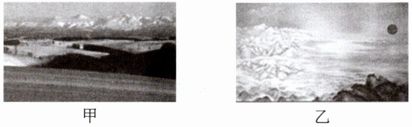 12. [领会意境]小丽同学打算朗诵毛泽东的《沁园春·雪》,为更好地展现词上片的意境,她准备从下面两幅图中选用一幅作为 PPT(演示文稿)背景图,但不知选用哪一幅最合适。请你为小丽推荐,并说明理由。