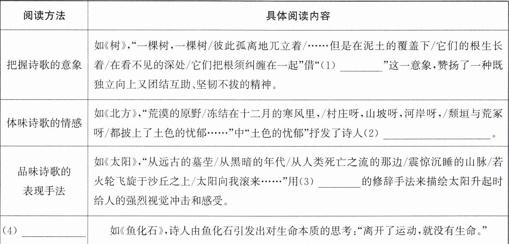 4. 小苏在阅读《艾青诗选》时采用了以下阅读方法,请完成下表。