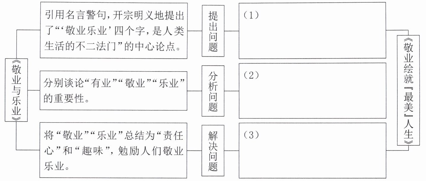 7. *议论性文章常采用“提出问题—分析问题—解决问题”的思路进行论证。请根据《敬业与乐业》及本文内容,补全下图。