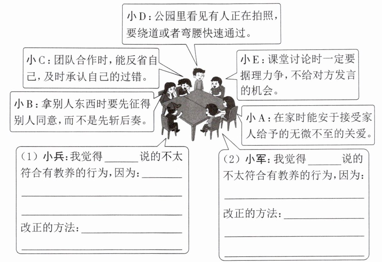 10. 学完《论教养》后,同学们围绕“教养”这一主题开展了讨论,大家又举了一些生活中的事例表达自己的理解,可是小兵和小军发现有两位同学所举的事例并不符合文中对“有教养”的阐释,请你找出并简述理由,同时说出改正的方法。