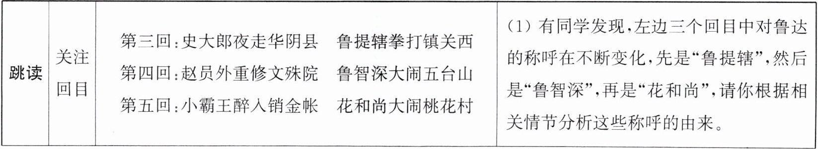 4. 有同学以《水浒传》和《西游记》为代表,在活动中与大家分享了自己阅读小说的方法,请你根据提示,完成表格中的题目。