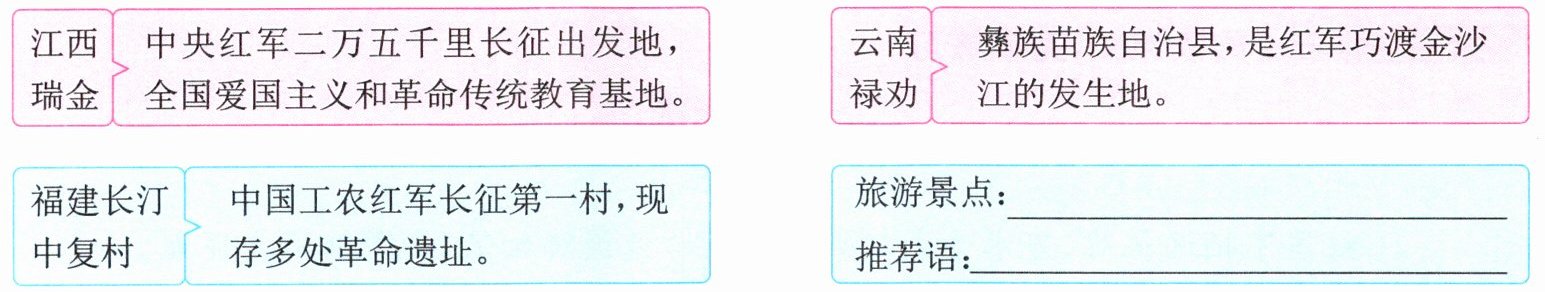 1. [任务一:长征地点我推荐] 同学们决定选取一个红色旅游景点作深入研究。请你仿照示例,从同学们列出的三个地点中选择一个推荐,并写出推荐语。