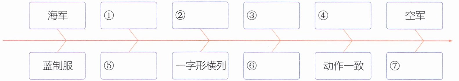1.(1)①步兵 ②炮兵 ③战车师 ④骑兵师 ⑤齐步行进 ⑥整齐前进 ⑦排成人字形 (2)点 面 庄严、隆重 赞美 2.(1)③④ ①② (2)庄严、隆重、气势恢宏 战旗方队 坦克方队 3. 示例:当战车部队经过的时候,……欢呼声盖过了飞机的隆隆声。 单独描写空军阅兵的场面,表现了人们看到自己国家的飞机飞上蓝天的激动心情以及对祖国未来繁荣发展的期待。