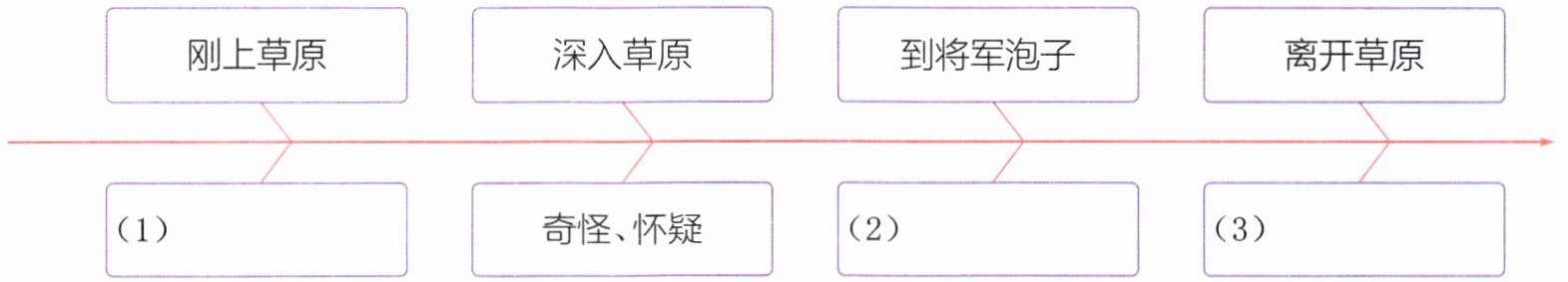 4. 第①自然段画“____”的句子中,直接写草原景色的句子有______,写作者感受的句子有______。(填字母)这样写的好处:______。