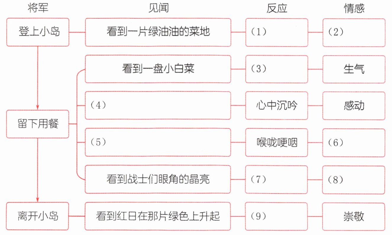 (1)不由得一愣 (2)吃惊 (3)脸色变了 (4)看到构成中国地图图样的菜地 (5)看到战士们桌上的罐头 (6)心疼 (7)鼻子发酸 (8)激动 (9)行了军礼