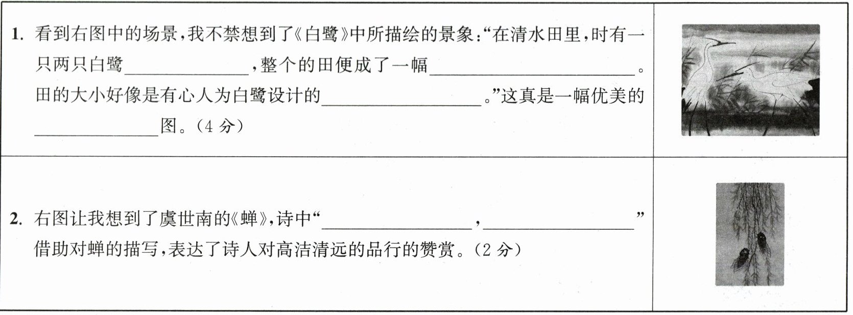 四、大自然中的生灵,不仅是现实中的美好存在,更是文人笔下的灵感源泉。根据课文内容填空,感悟生灵所蕴含的意象。(6分)